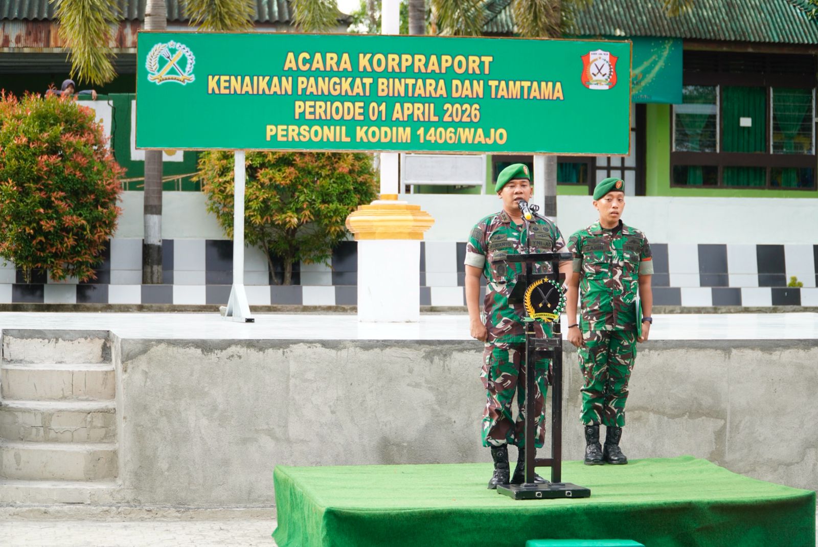 WAJO Geachanel.com—Komando Distrik Militer (Kodim) 1406/Wajo menggelar kegiatan Kopraport kenaikan pangkat bagi personelnya yang berlangsung khidmat di Lapangan Upacara Makodim 1406/Wajo, Jalan Kejaksaan No. 55 Sengkang, Kelurahan Buluppabulu, Kecamatan Tempe, Kabupaten Wajo, Selasa (7/4/2026).